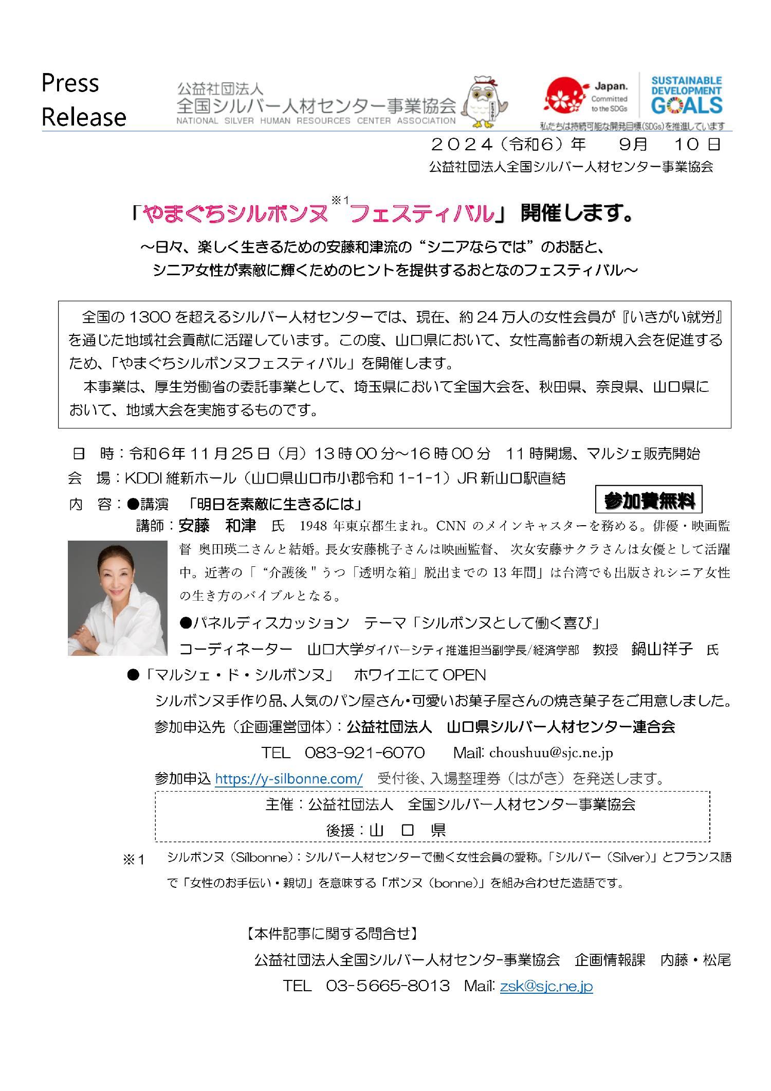 全国の1300を超えるシルバー人材センターでは、現在、約24万人の女性会員が『いきがい就労』を通じた地域社会貢献に活躍しています。この度、山口県において、女性高齢者の新規入会を促進するため、「やまぐちシルボンヌフェスティバル」を開催します。